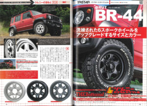 BRUTホイール「BR-44」Milky White(ミルキーホワイト)を装着したジムニー・ノマドが見開きで掲載・紹介されております。(P120 – 121)