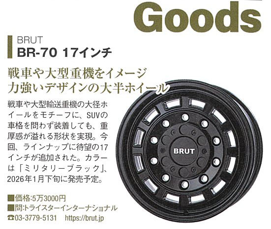 Goods紹介ページにてランクル250に装着できる新しく設定したサイズの17インチBRUTホイール「BR-70」Military Black(ミリタリーブラック)が掲載・紹介されております!(P145)