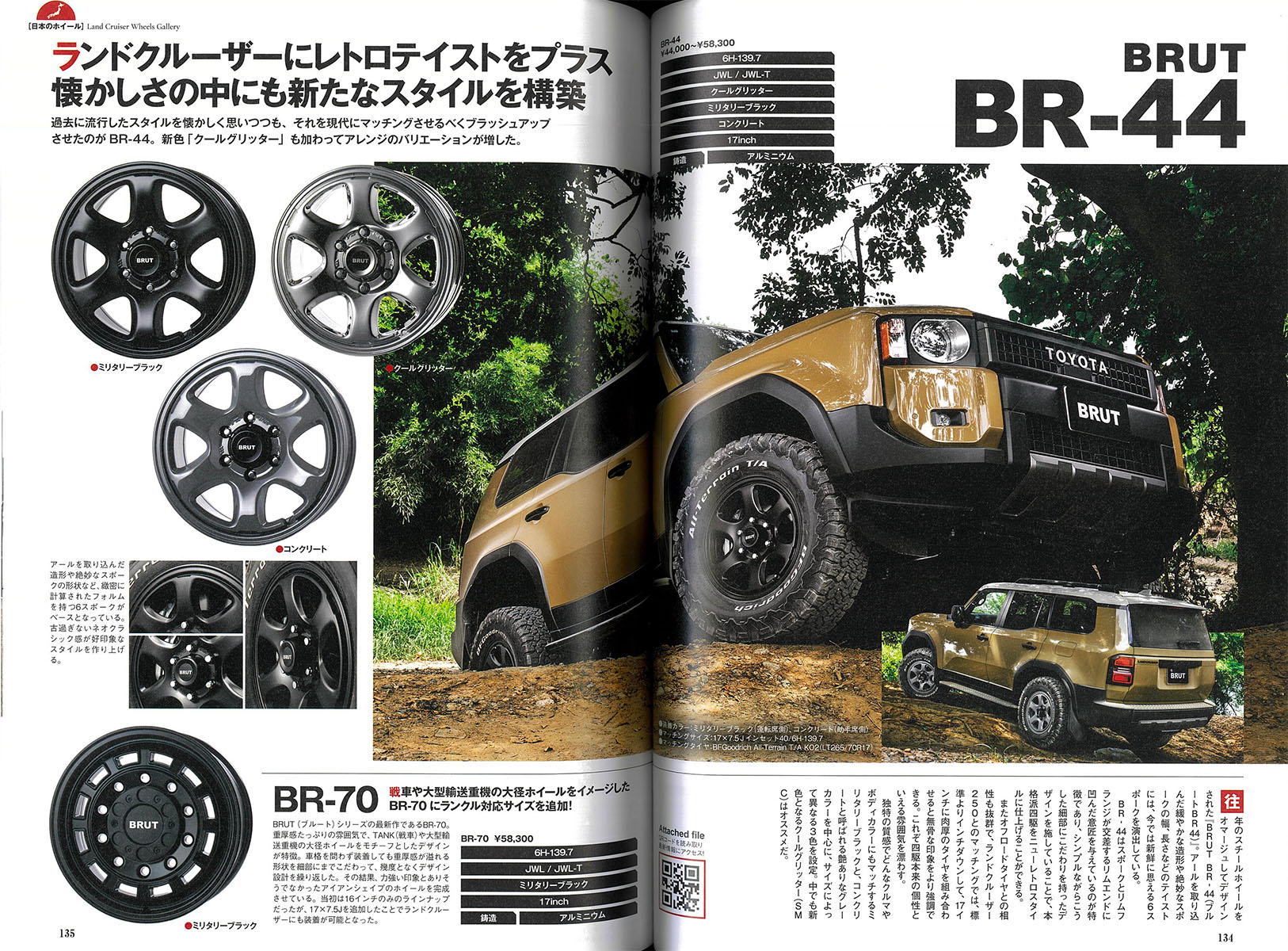 BRUT ホイール「BR-44」Military Black(ミリタリーブラック)& Concrete(コンクリート)を装着したLAND CRUISER 250が掲載・紹介されております。(P134 – 135)