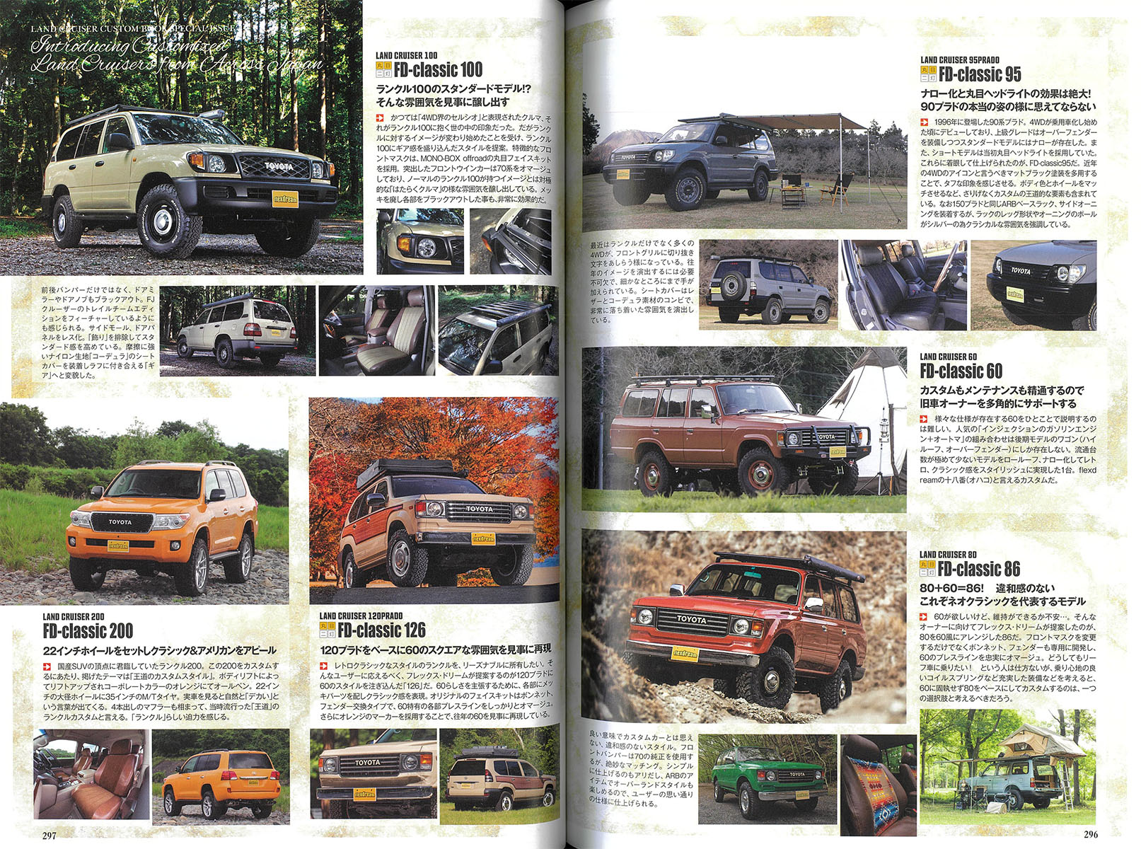 BRUT ホイール「BR-00」を装着したフレックスドリームデモカーのランドクルーザーが多数掲載・紹介されております。(P296 – 297)