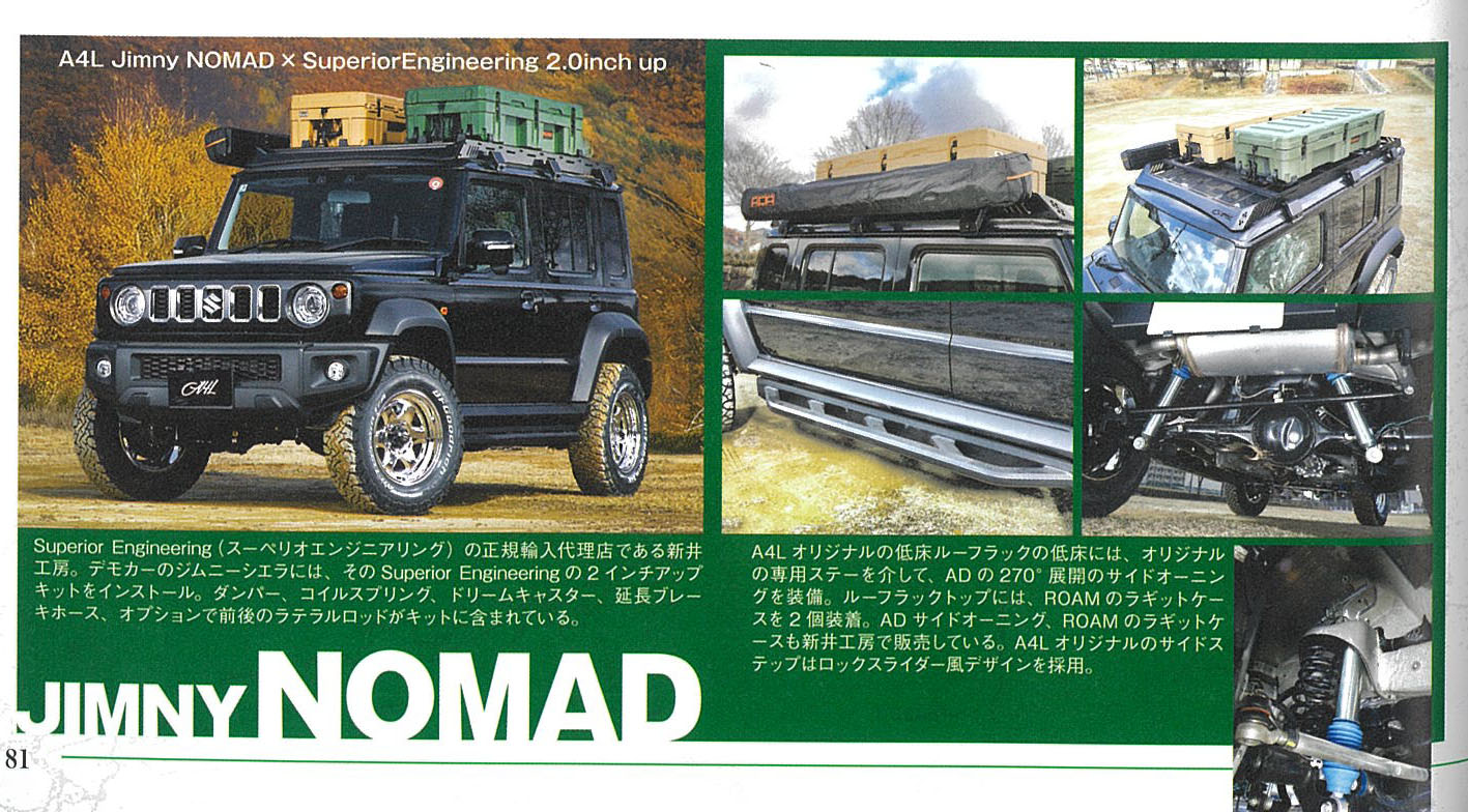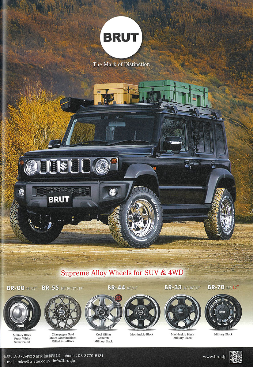 BRUTホイール「BR-44」待望の新色! Cool Glitter(クールグリッター)を装着したジムニー・ノマドが掲載されております。(P81) (画像をクリックすると大きくご覧いただけます。) 古き良きデザインを踏襲した「BR-44」の鉄チン&メッキ風な雰囲気を是非ご覧ください!